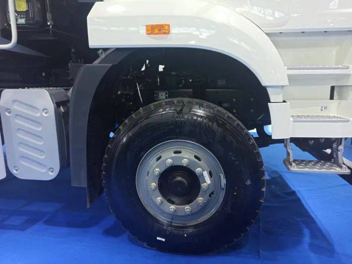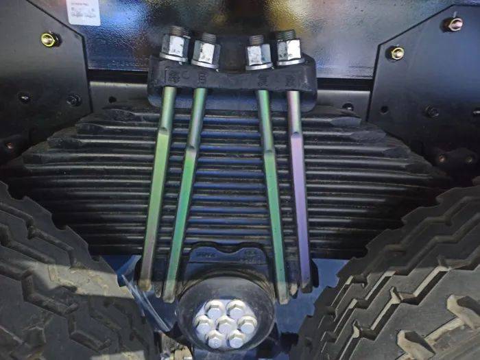 该车前桥额外载荷为9吨,后桥额外载荷为16吨×2,主减速器速比为5.921。悬架方面,该车前悬和后悬选用多片簧方式,钢板簧数量均为12片。制动方面,该车行车制动为鼓式制动,前制动方式为鼓式,后制动器型式为鼓式,驻车制动方式为压缩空气操控的绷簧储能驻车制动体系,辅佐制动为发动机排气制动。整车电压为150Ah蓄电池,油箱为钢油箱400升。
