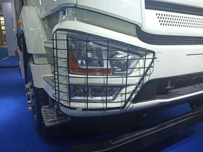 与国内车辆不同的是,左右前大灯上均安装了一个巩固的防护罩,对前大灯起到防护的效果。其效果有两点,一是维护前大灯不被运送场景中的石块损坏,二是可防止前大灯玻璃直接与尘埃、各种小虫相碰,使其在持久的运用中,仍然在夜间行车时坚持高亮度,安全行车得到进一步的保证,因而该防护罩也能够称之为“防虫罩”。