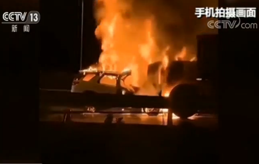 这段由路人拍下的近两分钟的视频,记录了白色车辆从前侧浓烟滚滚到整辆车被明火吞噬的过程。视频被发布在网络上之后,引发了大众的各种讨论: